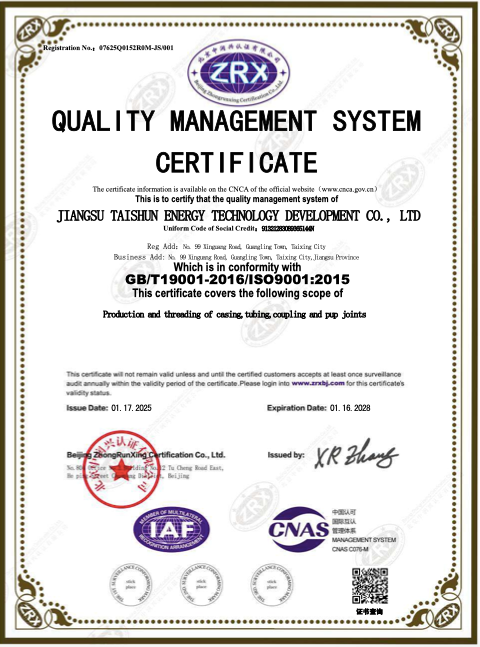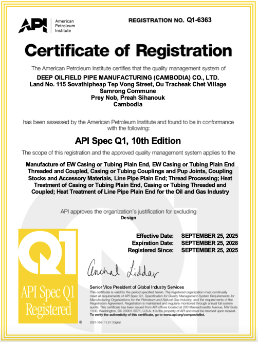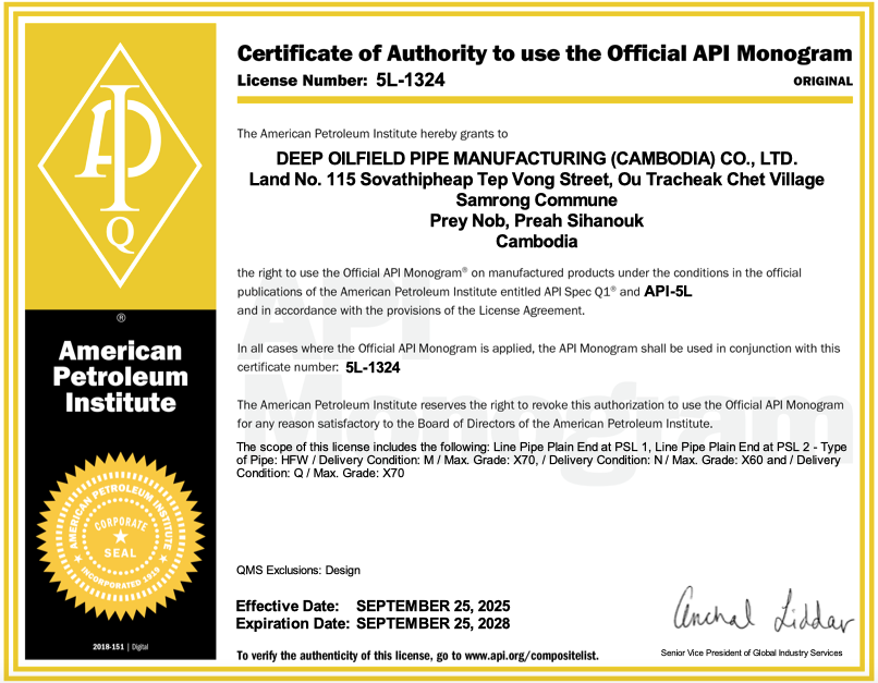Certifications apply to carbon steel and OCTG products supplied by Tianjin United Petroleum Technology Co., Ltd. / Deep Oilfield Pipe Manufacturing (Cambodia) Co., Ltd.
